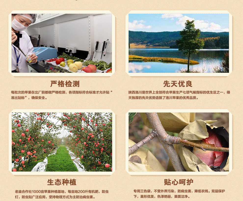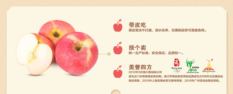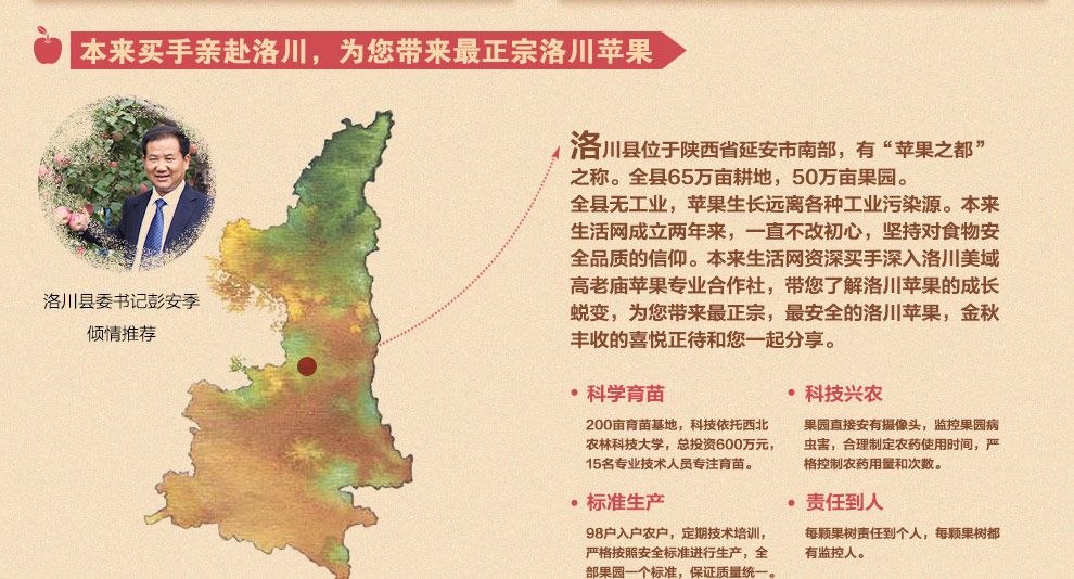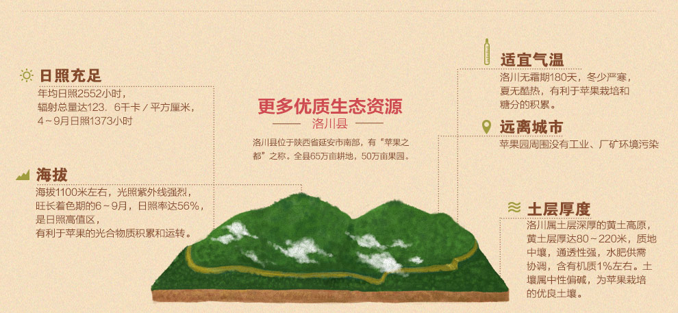 特點:果形優美,個大均勻,果面潔凈,色澤艷麗,肉質脆密,含糖量高、香甜可口,硬度適中,耐貯藏,全國同類蘋果之冠。 介紹:陜西洛川蘋果以色香味俱全著稱,洛川縣是中國蘋果外銷的重要生產基地之一,陜西洛川的蘋果種植面積達50.8萬畝,洛川人均占有蘋果比全國平均水平高出5倍,洛川蘋果有很多知名優良品種,眾所周知的紅富士蘋果就是洛川蘋果的一種,還有紅星、紅元帥、紅冠、國光、秦冠、黃元帥等;洛川蘋果的品質源自陜西黃土高原年均日照2552小時,海拔1100米左右,晝夜溫差大,病蟲害少,有利于蘋果栽培和糖分的積累,洛川出產的蘋果香味濃厚、耐儲存、營養價值高。常吃蘋果對人體健康有益,除了鮮食,陜西洛川蘋果還可以熟食、研制、干制、烤制,以及加工做蘋果罐頭、蜜餞、國建等工人享用。